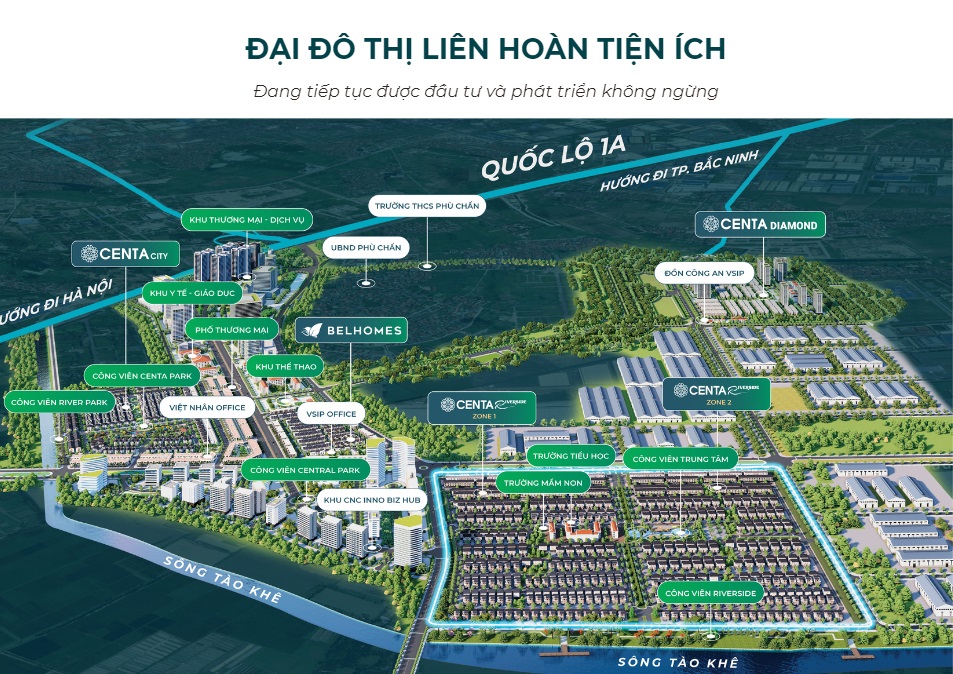 Centa Riverside tọa lạc tại đường Hữu Nghị, phường Phù Chẩn, Từ Sơn, Bắc Ninh – ngay trái tim của Đại đô thị Công nghiệp – Dịch vụ VSIP. Đây là vị trí chiến lược giao thoa giữa Hà Nội – thủ đô văn hiến và Bắc Ninh – vùng đất địa linh nhân kiệt.