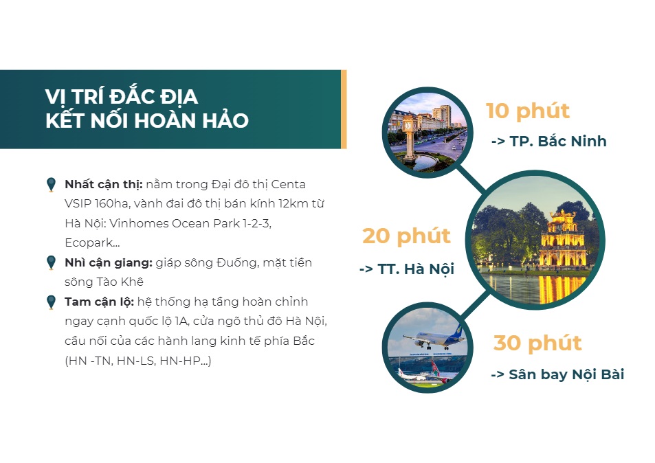 Centa Riverside nằm trong quần thể Đại đô thị Centa City 150ha chuẩn mực Singapore lớn nhất Thành Phố TỪ SƠN. Kết nối giao thông thuận_tiện: Cách trung tâm thủ đô Hà Nội 15 phút di chuyển, 30 phút đến sân bay Nội Bài và 10 phút đến thành phố Bắc Ninh. Hệ thống hạ tầng đồng bộ bài bản, tiện ích trong tầm tay: siêu thị, bệnh viện, trường học liên cấp quốc tế, trung tâm thương mại,
